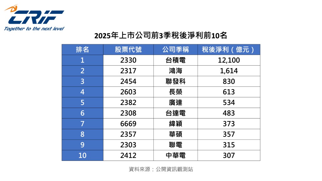 從前3季稅後淨利前10名來看,台積電持續以稅後淨利1兆2,100億元穩於第1名,較2024年同期大幅成長51.63%,並創下前3季獲利的歷史新高。鴻海前3季稅後淨利達1,614億元,較2024年同期成長35.4%,同樣創下同期新高,排名第2。聯發科雖以稅後淨利830億元位居獲利第3,但稅後淨利較2024年同期微幅衰退0.24%。長榮以稅後淨利約613億元排名第4,較2024年衰退45.32%。廣達以稅後淨利534億元排名第5,較去年同期成長20.81%,並創下前3季的歷史新高。台達電以稅後淨利483億元排名第6,較2024年同期成長45.92%,同樣刷新同期歷史紀錄。