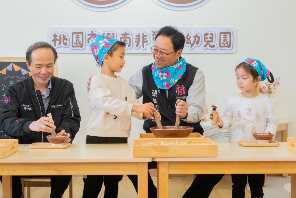 張善政說明,興南非營利幼兒園共設六個班級,其中四班為兩歲專班、二班為混齡班,可有效滿足中壢地區年輕家庭快速增加的托育需求。張市長指出,桃園整體幼托需求仍持續上升,一一四學年度全市兩歲專班已達二百班,其中一百二十三班為近三年新增,顯示桃園在少子化趨勢下仍維持相對穩定的生育力,也反映市府在托育政策上的成果。