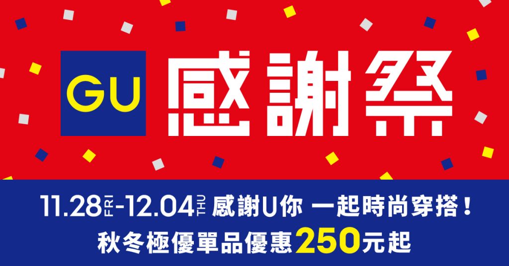 今年最強購物盛事來了!日本時尚品牌GU感謝祭將於11月28日至12月4日全台門市與網路商店同步開跑,帶來前所未有的驚喜優惠。秋冬必備單品最低 $250起,更有全球銷售突破千萬件、人氣No.1「BARREL LEG錐形褲」限時降價$200元,只要$790就能入手!不僅如此,活動期間不限金額消費即可參加「萬元購物金抽獎」,再加碼推出年度獨家獻禮──三位台灣人氣插畫家(威嗝高校、Mush-Eat MushRoom食菇、小高潮色計事務所)聯手打造「GU兩用雙享杯飲料袋」,單筆消費滿$1,800即可獲得乙個,六款設計以盲袋形式隨機贈送,數量有限,送完為止!