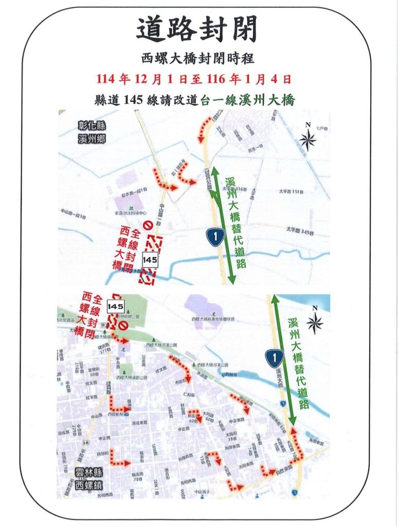 施工期間已請施工單位完整設置改道路線指引與警示標誌、加派人員協助交通指揮與動線引導等措施。建請用路人提前改行省道台一線(溪州大橋)作為替代路線,並配合現場管制人員指揮,施工期間造成不便,敬請見諒。