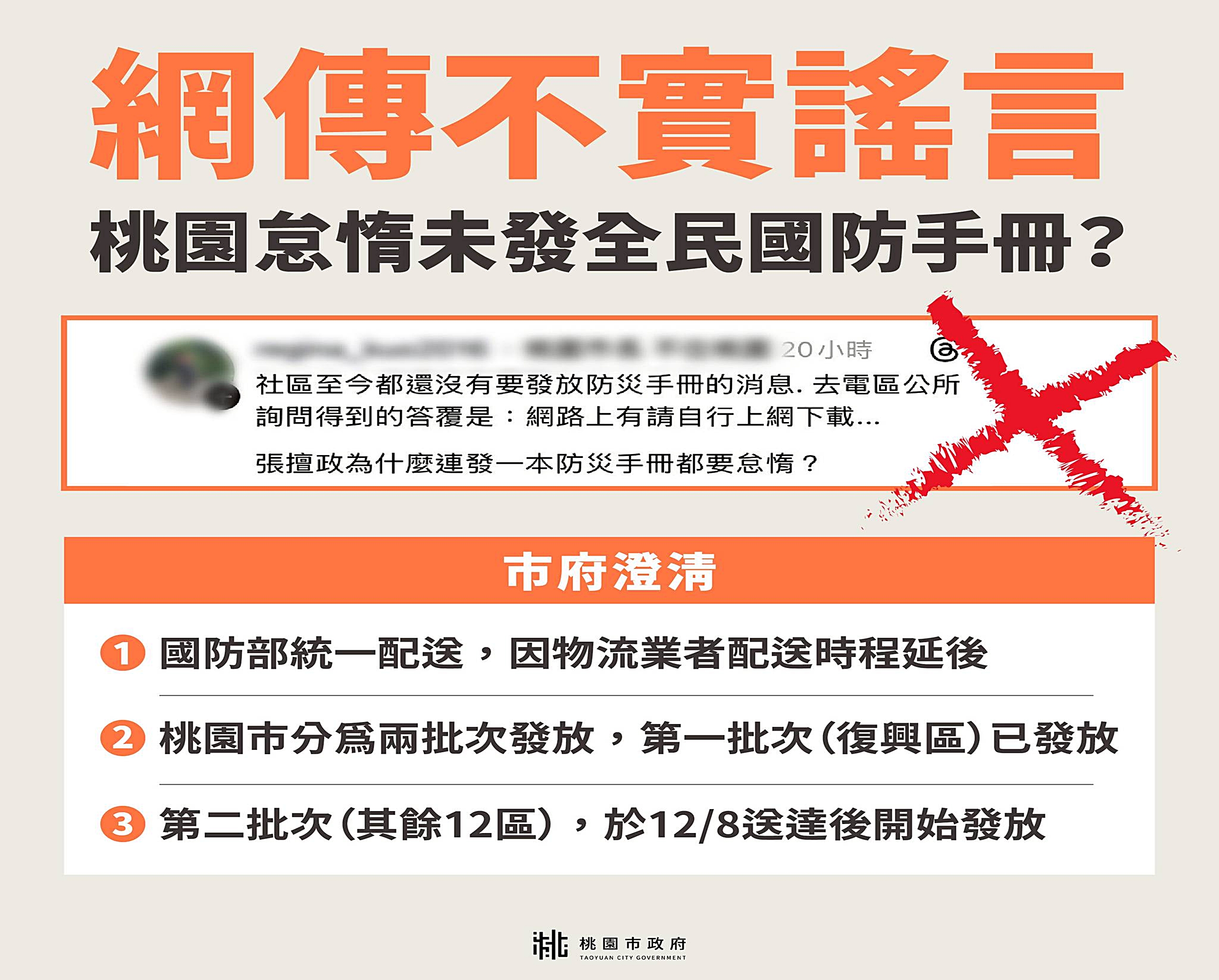 針對網路謠言,指稱桃園市怠慢處理全民國防手冊發放,桃園市政府二十七日回應,全民國防手冊的印製與配送作業皆由國防部統籌,並直接寄送至各區公所,目前復興區公所已於十一月二十四日下午收到手冊,透過里鄰系統進行家戶發放,至於桃園市第二批次手冊,中央表示因物流業者配送時程延後,預計將於十二月八日左右配往其餘行政區,呼籲市民及網友勿聽信謠言,以訛傳訛。