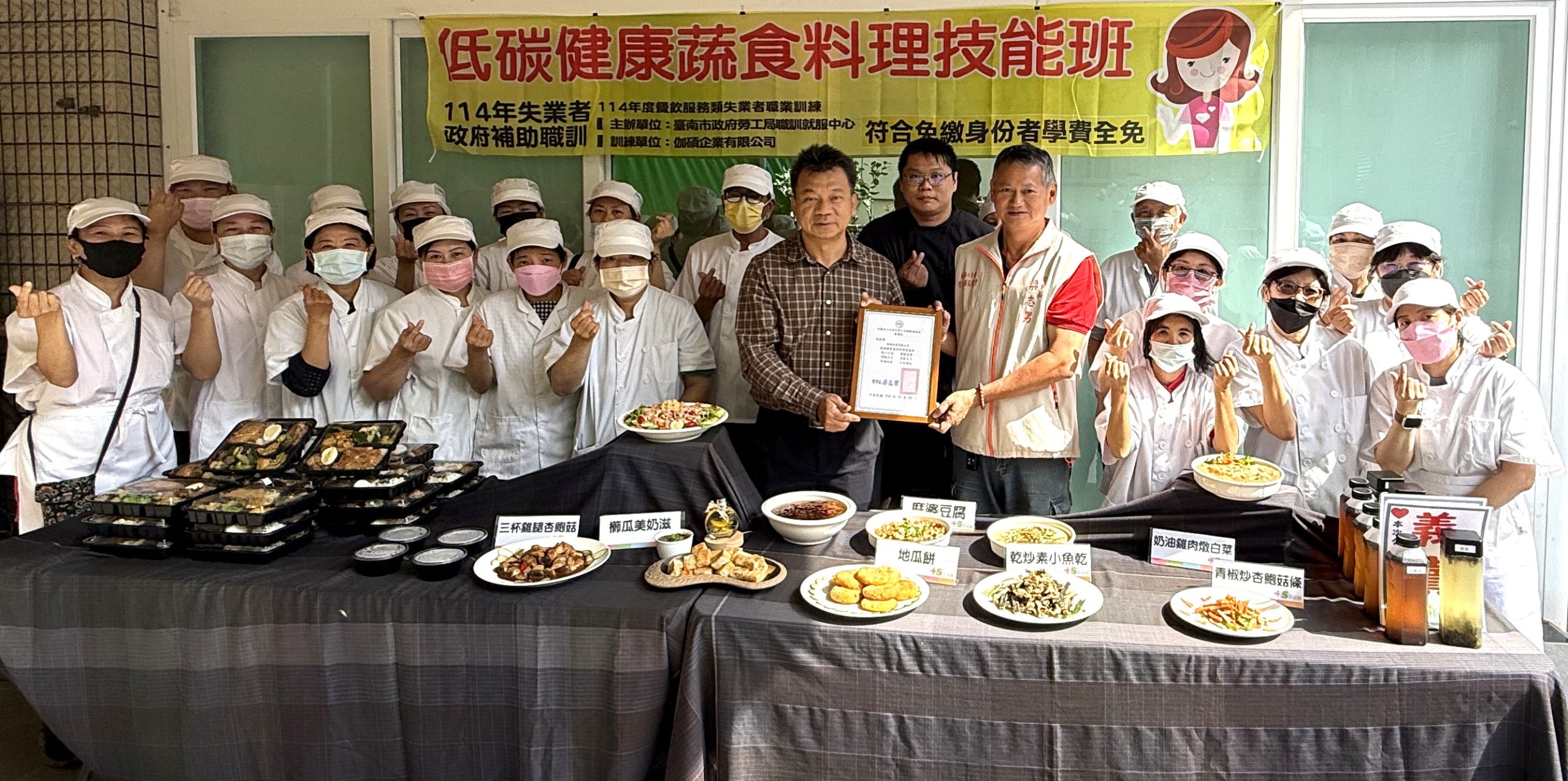 「低碳健康蔬食料理技能班」以低碳飲食與健康生活為核心,課程結合理論與實作訓練,引導學員從食材挑選、食品安全、營養計算到料理創作全方位學習,透過系統化培訓,使學員能因應市場需求,提升就業能力與創業潛力。