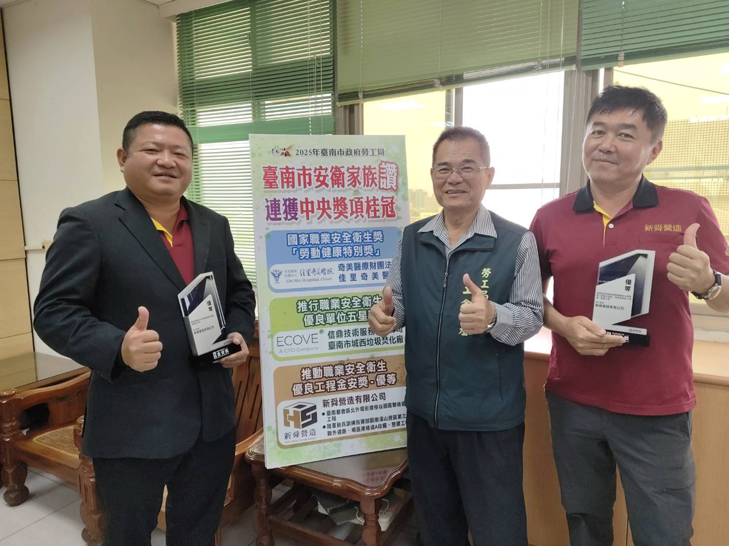 新舜營造今年有兩項道路工程獲得勞動部金安獎優等的肯定,新舜營造是勞工局「安心舜力」家族的核心企業,平時對推動職安不遺餘力。
