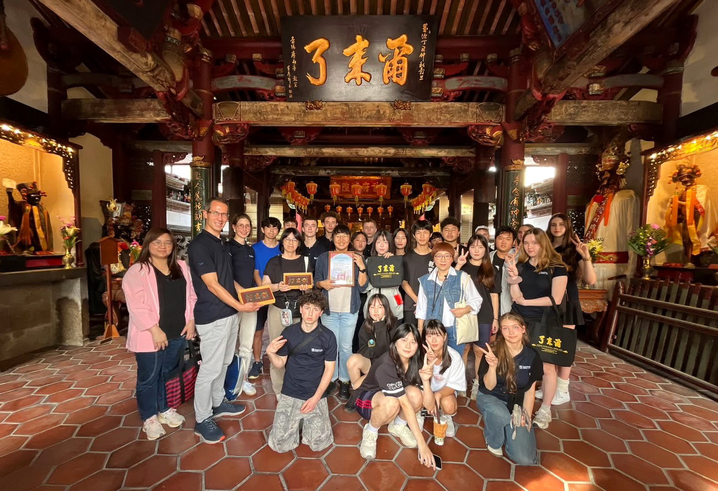 台南高商師生帶德國交換學生前來台灣府城隍廟參訪,並教導廟方人員說德語的“爾來了”。 (記者陳俊文攝)