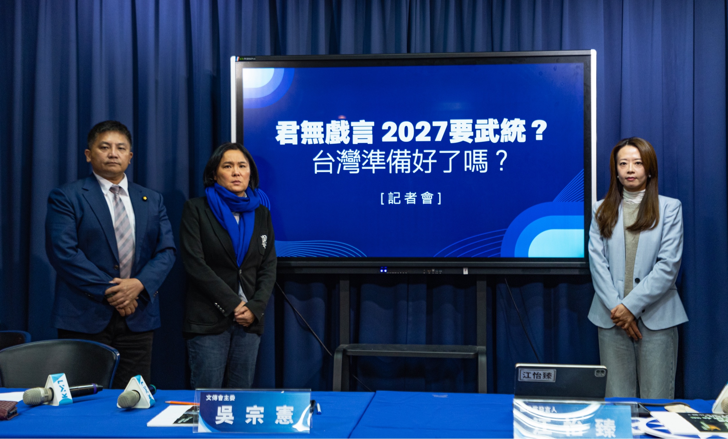 國民黨就賴總統提及「中國大陸以二0二七武統台灣為目標」召開記者會,文傳會主委吳宗憲、立法委員陳玉珍、發言人江怡臻出席。(國民黨提供)