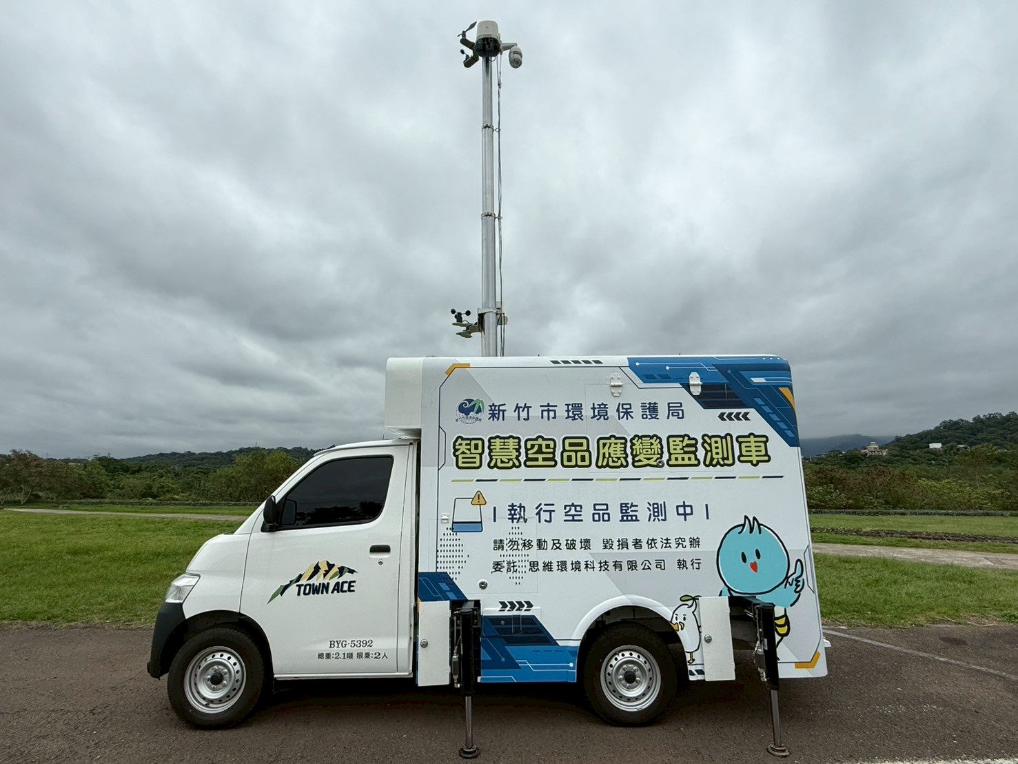 新竹市環境保護局打造「智慧空品應變監測車」,此車輛是專為臨時性空污事件應變設計的移動式監測平台,車輛搭載空品微型感測器與可三百六十度旋轉的六公尺高架攝影機,讓應變人員能在安全距離外進行遠端監測,此外,非執勤時段亦可作為移動監測點,針對露天燃燒好發區執行環境監測任務,展現竹市在智慧治理與重視環保的創新作為。