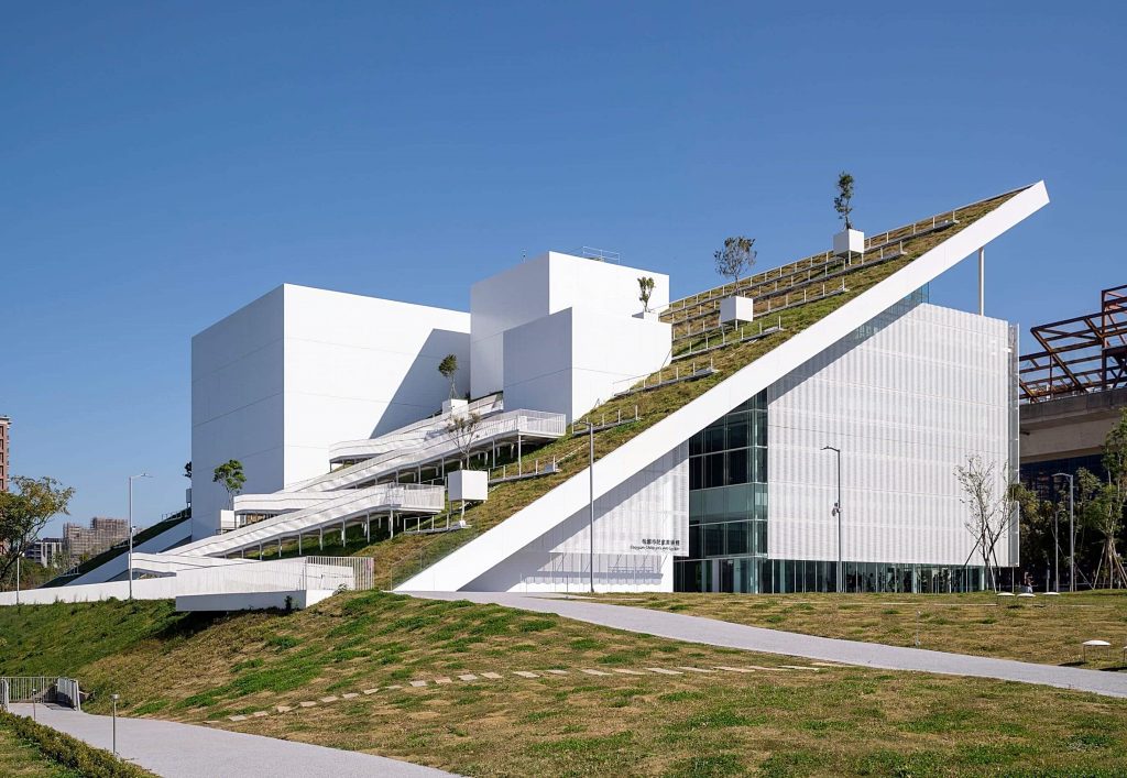 本案建築外觀以夢幻且充滿創意的「藝術山丘」造型為主體,量體呈現如大地起伏般的柔和曲線,象徵自然與藝術的交織,設計靈感呼應桃園「千塘之鄉」的地方紋理,融合青塘園周邊的水景與綠帶,使建築與環境相互呼應、融為一體。透過山丘式斜坡的設計,串聯戶外平台、綠蔭涼亭與展望台,不僅可做為藝術活動時的觀眾席,更成為市民休憩停留的新據點,沿坡漫步可俯瞰廣場與青塘園景致,將城市風貌與自然美景巧妙融合,打造親近生活的藝術場域。