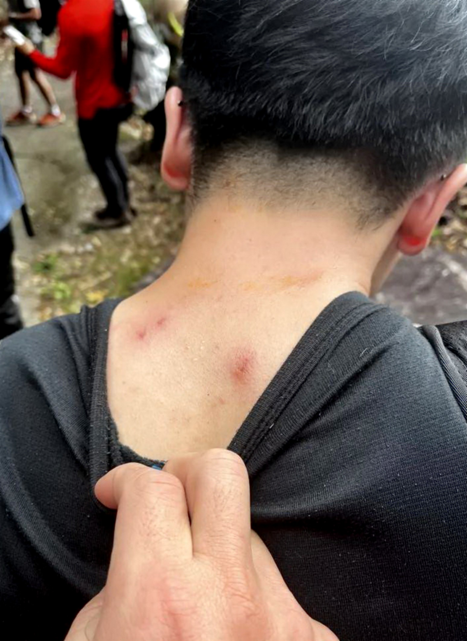 登山客背部、頭部都有遭虎頭蜂螫傷痕跡,被送醫治療。(記者陳金龍翻攝)