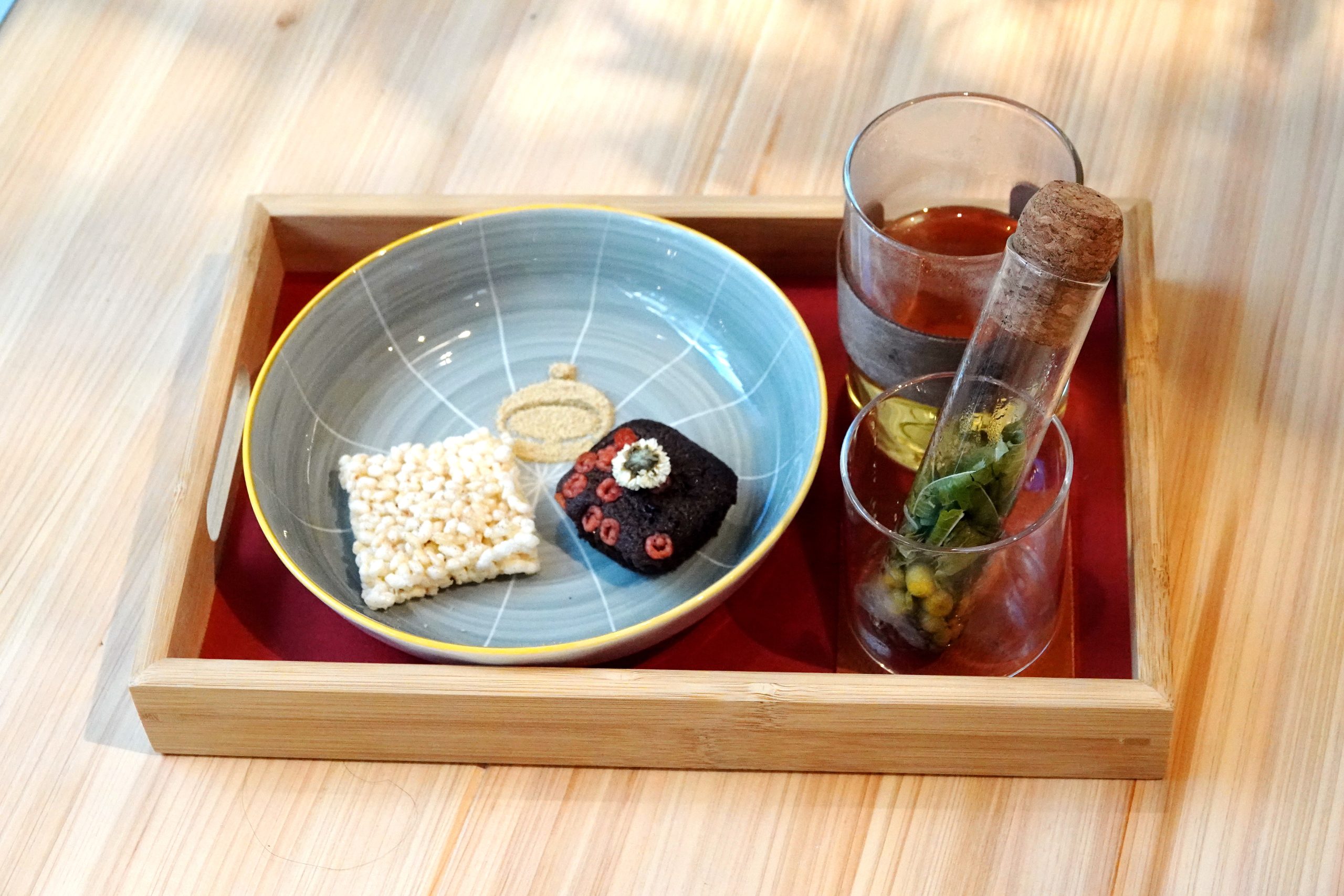 比較不同的是它不像一般花草茶是整壺沖泡,而是裝在一支下層開有三個細孔的實驗室用試管,以九十五C熱水沖泡試管,經蒸氣浸潤,熱氣往上凝聚在軟木塞開口處,打開軟木塞,花草香噗鼻,洛老師說,宮崎盞的下午茶都從聞開始,有點像老人茶的聞香杯。