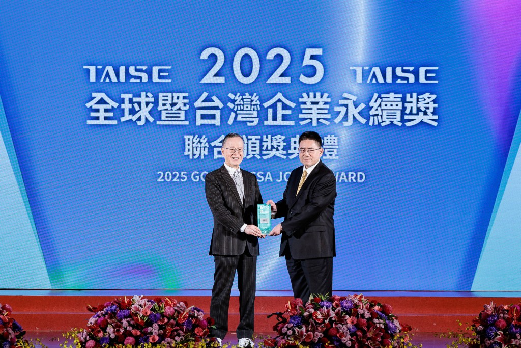 凱基銀行榮獲台灣企業永續獎氣候領袖獎肯定,由台灣永續能源研究基金會董事長簡又新頒獎,凱基銀行副總經理王志欽(右)代表領獎。(凱基銀行提供)