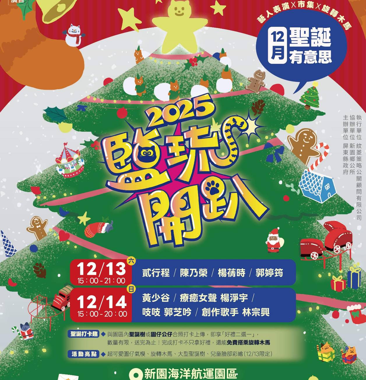 屏縣新園鄉鹽埔漁港海洋航運園區2025年「鹽琉開趴」最終場「聖誕有意思」,即將於十二月十三、十四日登場;兩天活動皆自下午三時至晚間九時展開,以「港邊聖誕」為核心意象,結合在地文化、星光聖誕市集與音樂演出,打造專屬於南國的節慶風貌,要與民眾共同迎接年末氛圍最濃厚的聖誕盛事。
