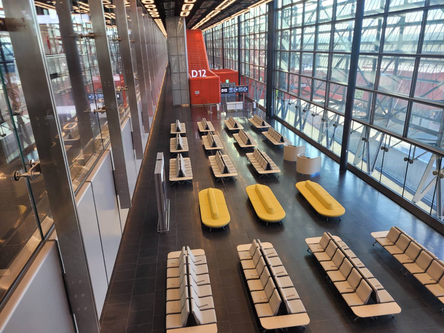 桃園機場第三航廈北登機廊廳採挑高設計,寬敞舒適且視野開闊,讓旅客留下深刻印象。(記者傅希堯攝)
