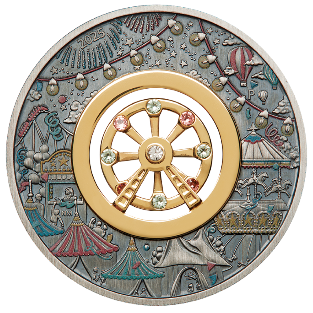 「摩天輪2英兩仿古彩色銀幣」由澳洲柏斯鑄幣局鑄造,主題面描繪一系列以傳統嘉年華為主題的圖案:繁星、雲彩和懸掛的彩燈點綴夜空,色彩繽紛的熱氣球、歡快的旋轉木馬、擺盪的鞦韆、嬉戲的兒童、嘉年華帳篷以及令人興奮的雲霄飛車交織出歡樂氛圍。幣緣鐫刻年份2025,以及柏斯鑄幣廠的「P」字印記,周圍環繞著璀璨煙火,細節精緻動人。銀幣中心的旋轉摩天輪鑲嵌彩色施華洛世奇水晶,搭配24K金鍍飾,耀眼奪目,生動重現嘉年華的魔幻時刻。