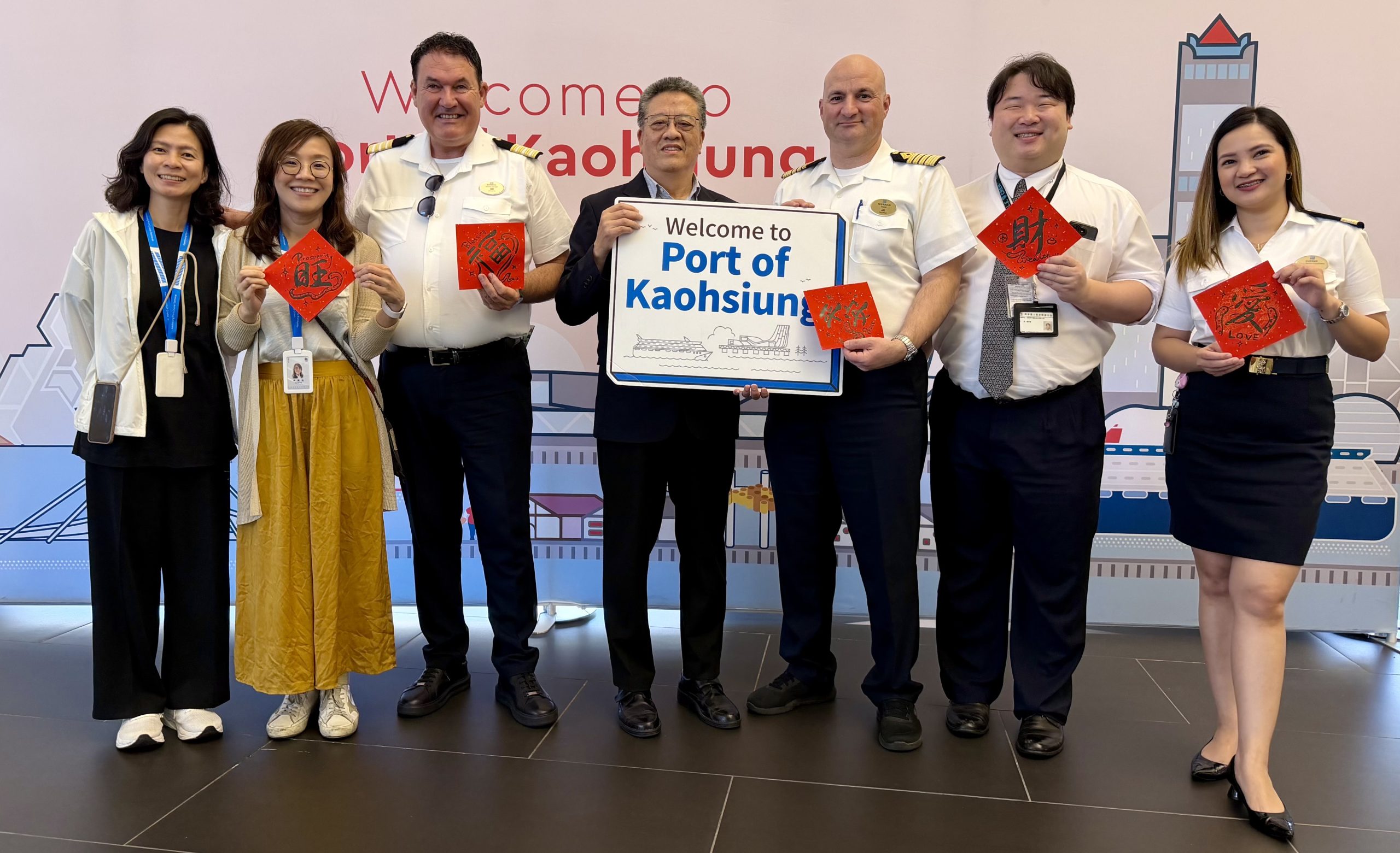 為使郵輪旅客一抵達高雄港旅運中心即能感受到高雄港的熱情,高雄港務分公司攜手高雄市政府海洋局,以傳統原住民迎賓舞蹈表演,歡迎旅客蒞臨,充分展現臺灣文化特色的活力,現場氣氛熱絡,同時安排春聯書法書寫體驗,由書法老師現場指導旅客親筆揮毫,更將旅客的英文名字翻譯成中文書寫成作品,成為國際旅客喜愛的臺灣文化體驗,並帶回最特別的紀念品留念,為旅客留下美好且難忘的回憶。