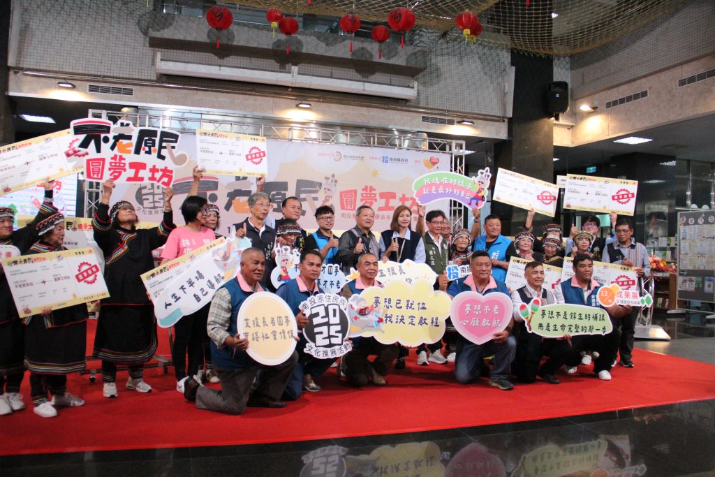 南投縣政府二日舉行南投「不老.原民」圓夢工坊成果展前宣傳活動,代表縣長許淑華主持的副縣長王瑞德,與縣議員林庭秝及眾多來賓和原鄉村長,偕這項圓夢計畫起點的武界文健站長輩們,將象徵「圓夢啟程」的登機證,張貼到「不老原民站」直達「圓夢工坊站」的機票上,宣示這項計畫不僅成功啟動,還將以成果展擴大呈現長輩們的圓夢創作心血。