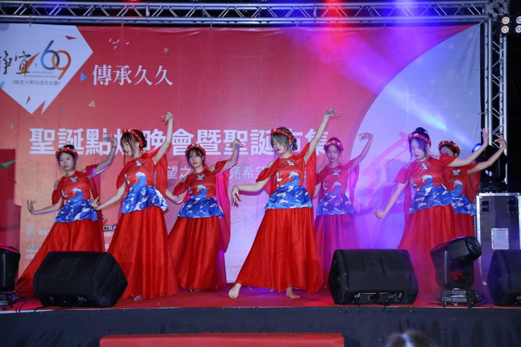 今年靜宜大學首次於校門口大草坪設置高達12公尺的大型聖誕樹,結合「聖誕點燈晚會暨聖誕市集」,以學生社團的原住民舞蹈開場,並由菲律賓、史瓦帝尼、越南等國際學生演出家鄉舞蹈,展現多元文化活力。現場佈置馬槽、天使、小羊等燈飾與光廊步道,將校園營造成溫暖的聖誕小鎮。