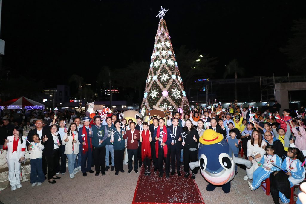 十五米高星光燦爛聖誕樹正式點亮,台南市長黃偉哲、遠東百貨總經理徐雪芳與上百位親子與民眾,共同見證幸福時刻。(大遠百提供)