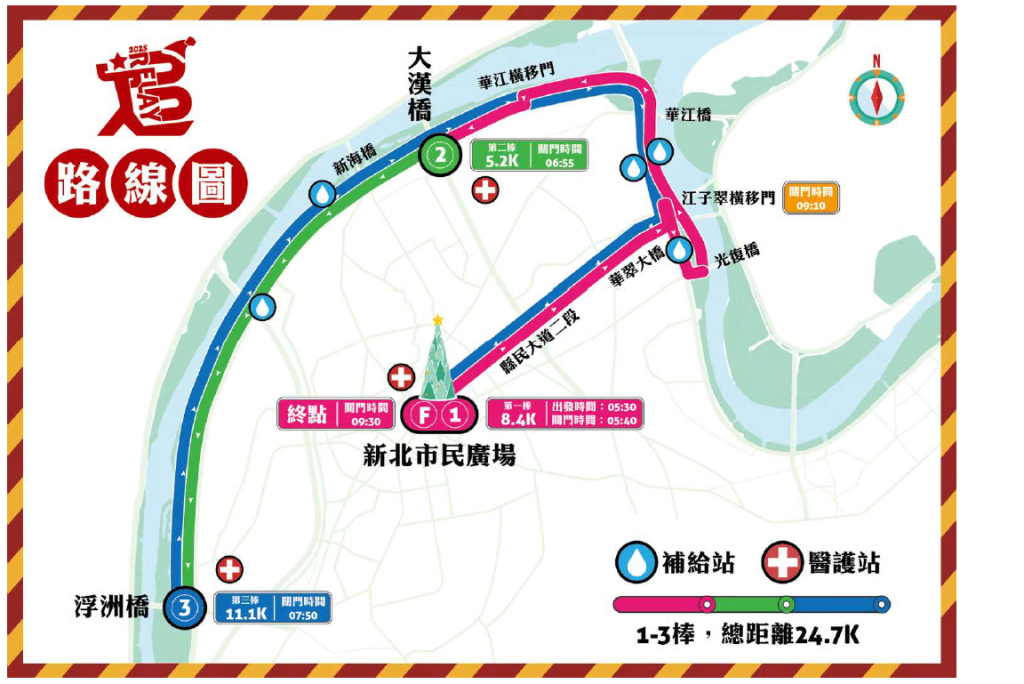 「2025新北市耶誕馬拉松接力賽」將於7日(星期日)清晨於新北市政府市民廣場舉行,本次賽事採3棒次接力賽制,預計有548隊、共1644名選手參賽,並於當(7)日清晨5時30分自市民廣場鳴槍起跑,行經縣民大道二段→華翠大橋(上橋) →華翠街左迴轉下橋→左轉縣民大道三段→江子翠橫移門→河濱公園內→江子翠橫移門→右轉縣民大道三段→華翠街右迴轉上橋,最終返回市民廣場,全長約24.7公里。