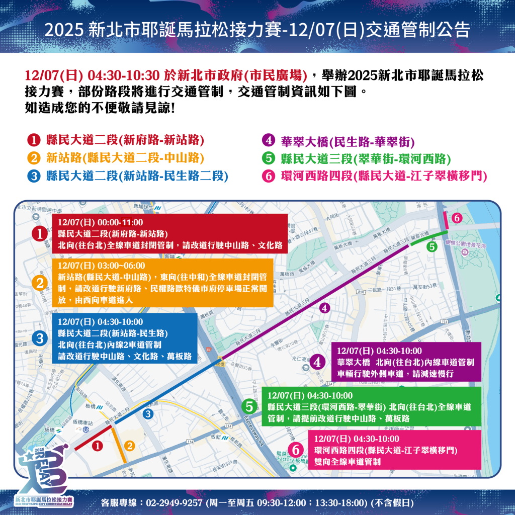 新北市交通警察大隊指出,為維護跑者及用路人安全,活動期間將實施下列交通管制措施,請民眾配合改道行駛:一、縣民大道二段(新府路-新站路)北向-往臺北市方向:12月7日0時至11時全線車道管制,請改道行駛民權路、中山路及文化路;二、新站路(縣民大道二段-中山路一段)東向-往中和方向:12月7日3時至6時全線車道管制,歐特儀市民廣場地下停車場保持入口暢通,請改道行駛民權路;三、縣民大道二段(新站路-民生路二段)北向-往臺北市方向:12月7日4時30分至10時內側2車道管制,請改道行駛中山路、文化路及萬板路;四、華翠大橋北向-往臺北市方向:12月7日4時30分至10時內側車道管制,車輛行駛外側車道,請減速慢行;五、縣民大道三段(華翠街-環河西路四段)北向-往臺北市方向:12月7日4時30分至10時內側車道管制,機慢車道保持外側通行,汽車等大型車輛請改道行駛中山路、萬板路及文化路;六、環河西路四段(縣民大道三段-江子翠橫移門)北向-往新莊方向:12月7日4時30分至10時全線車道管制,請改道行駛光環路及中山路。