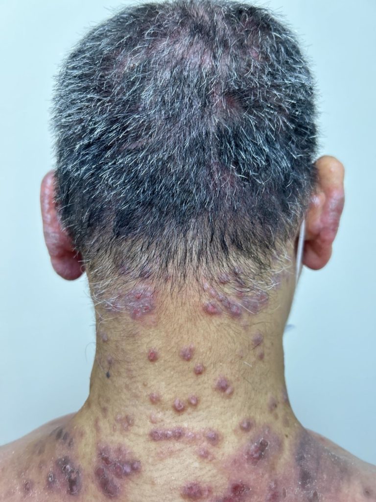 65歲林先生長年受異位性皮膚炎所苦,全身遍布丘疹與結節性癢疹,皮膚乾裂潰爛、癢到難以入眠,經常抓到遍體麟傷,前往台北慈濟醫院就診,經傳統藥物規律性治療後,皮膚科醫師廖澤源評估其病情無法以傳統治療有效控制,且符合健保給付標靶藥物的條件。使用後,林先生的搔癢症狀、皮膚病灶迅速獲得明顯改善,如今身上幾乎看不到病灶,只需定期回診進行控制性治療。