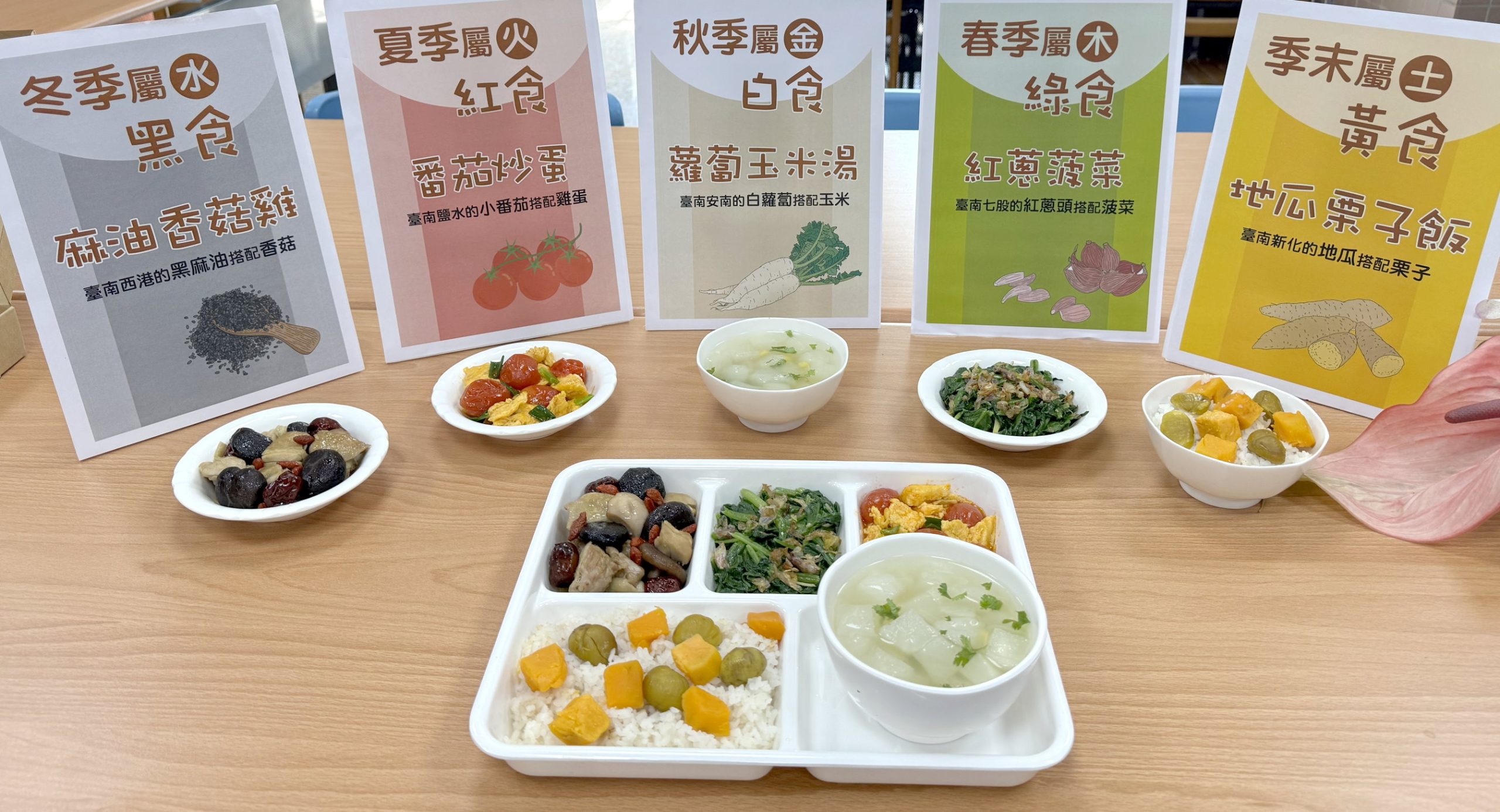 營養師王瓊嫣運用台南好吉曆食曆,依據四季與五行的飲食概念推出特色午餐料理。結合不同季節的當令產物,對應白綠黑紅黃五色在地食材,例如秋季白食選用安南的白蘿蔔搭配玉米,推出蘿蔔玉米湯;冬季黑食選用西港的黑麻油搭配香菇,推出麻油香菇雞等,彩色食物學均衡又營養,美味又健康。