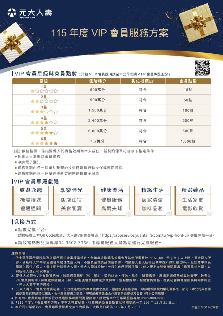 元大人壽秉持以客為尊的理念,透過保險商品協助客戶進行家庭財務及保障規劃,並專注於精進客戶體驗,持續提供優質服務。為感謝客戶長期的支持,元大人壽自今(2025)年12月起推出嶄新的VIP會員服務,涵蓋「行政禮遇」、「禮賓秘書」及「好禮兌換」等三大面向的會員專屬禮遇,為客戶創造全方位的尊榮體驗。
