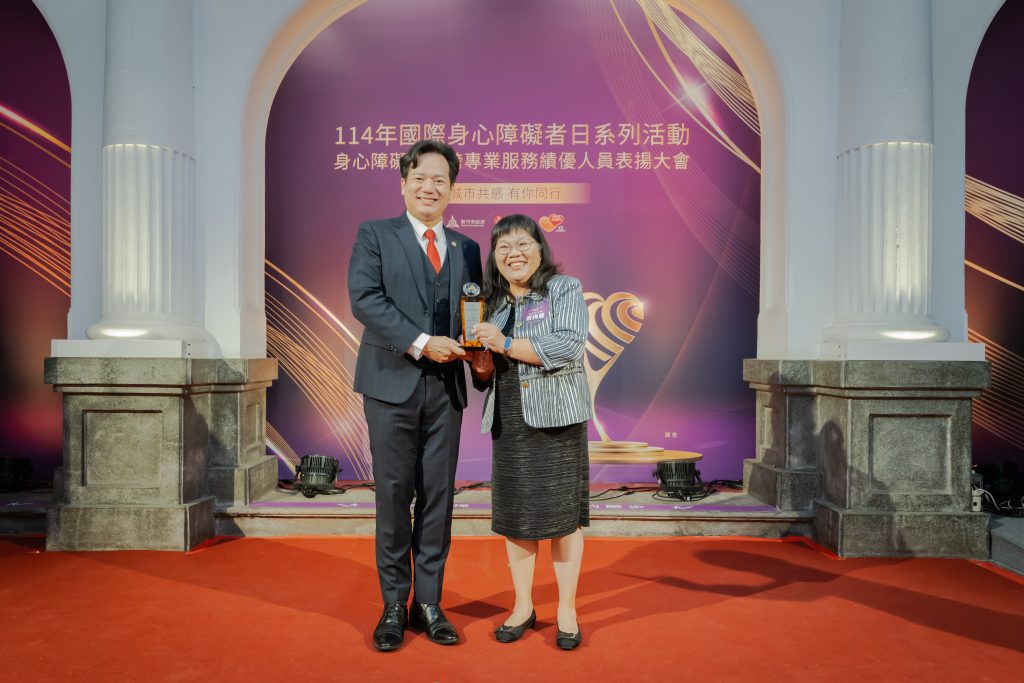 代理市長邱臣遠頒獎並感謝所有得獎者在第一線以高度專業、耐心及溫暖陪伴,成為身障朋友最堅實的後盾,也期盼能鼓勵更多人才投入,共同打造真正平權、溫暖的城市。