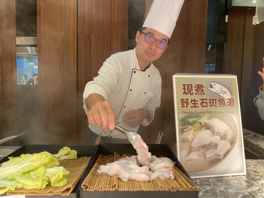 以中、西、日三大料理為主軸的Le Cafe 咖啡廳,打造精緻海陸自助饗宴,多款現做料理、精選海鮮與自製甜點一次匯集,視覺與味覺皆大幅升級。代理主廚李尚耕選用來自純淨海域的野生石斑,以現點現煮方式保留魚肉結實與膠質豐厚的口感,搭配薑絲、枸杞熬煮成清澈溫潤的湯頭,每一口皆是自然鮮甜。