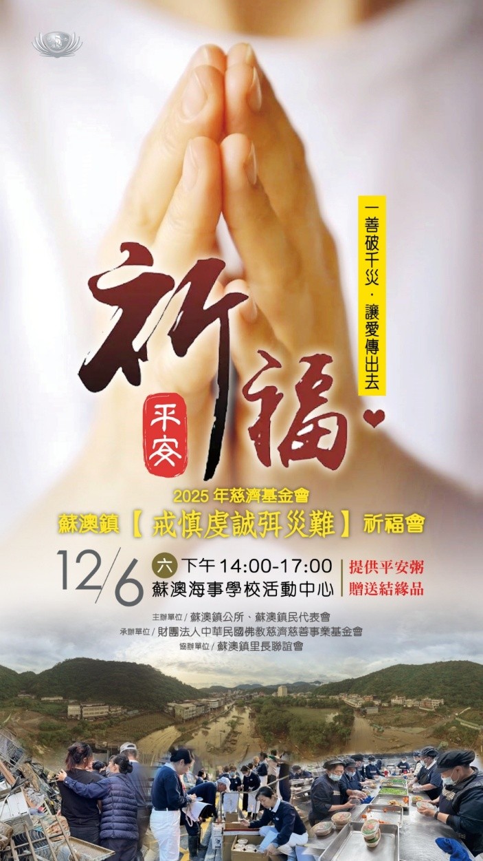 蘇澳鎮公所表示,為匯聚正能量及眾人善念,蘇澳鎮公所攜手慈濟慈善事業基金會,將於六日下午二時至五時,於蘇澳海事學校活動中心,舉辦「戒慎虔誠弭災難」祈福會。祈福會,以「一善破千災、讓愛傳出去」作為活動主軸,邀請鎮民朋友一同虔敬祝禱,凝聚安定人心的善念。