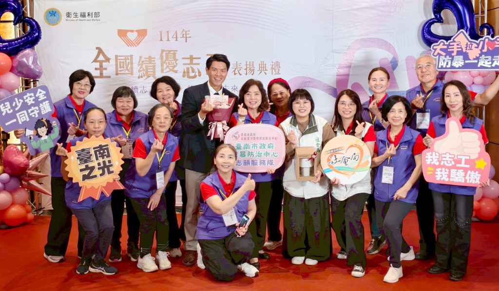 十二月五日為國際志工日。衛生福利部舉辦一一四年全國績優志工表揚典禮,台南市政府家庭暴力暨性侵害防治中心志願服務隊榮獲「全國績優志工團隊獎」,市長黃偉哲致贈花束感謝志工多年奉獻。
