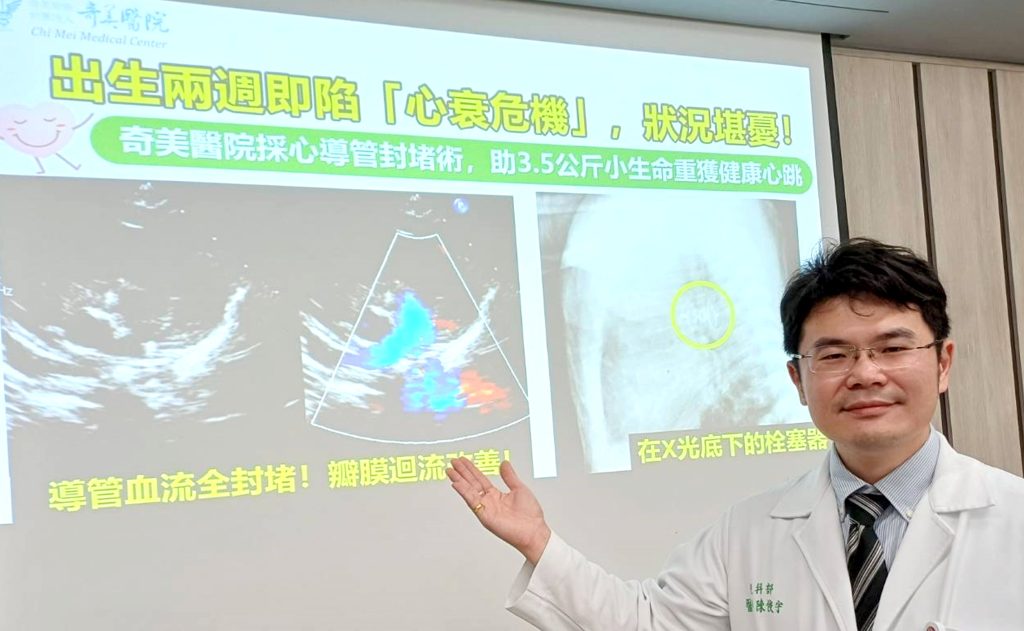 奇美醫兒科部兒童心臟科主任陳俊宇表示,開放性動脈導管(PDA)是一條應該要閉合的血管,屬先天性心臟病的一種,發生率約千分之一,原本應該在新生兒出生數日內自動閉合的血管若未正常關閉,可能導致急性心臟衰竭、呼吸困難等併發症。隨著醫療技術進步,目前已可使用心導管封堵術,以微創方式取代傳統「開心手術」,不僅傷口小,且復原時間較快,有效避免日後出現肺動脈高壓或猝死的悲劇。