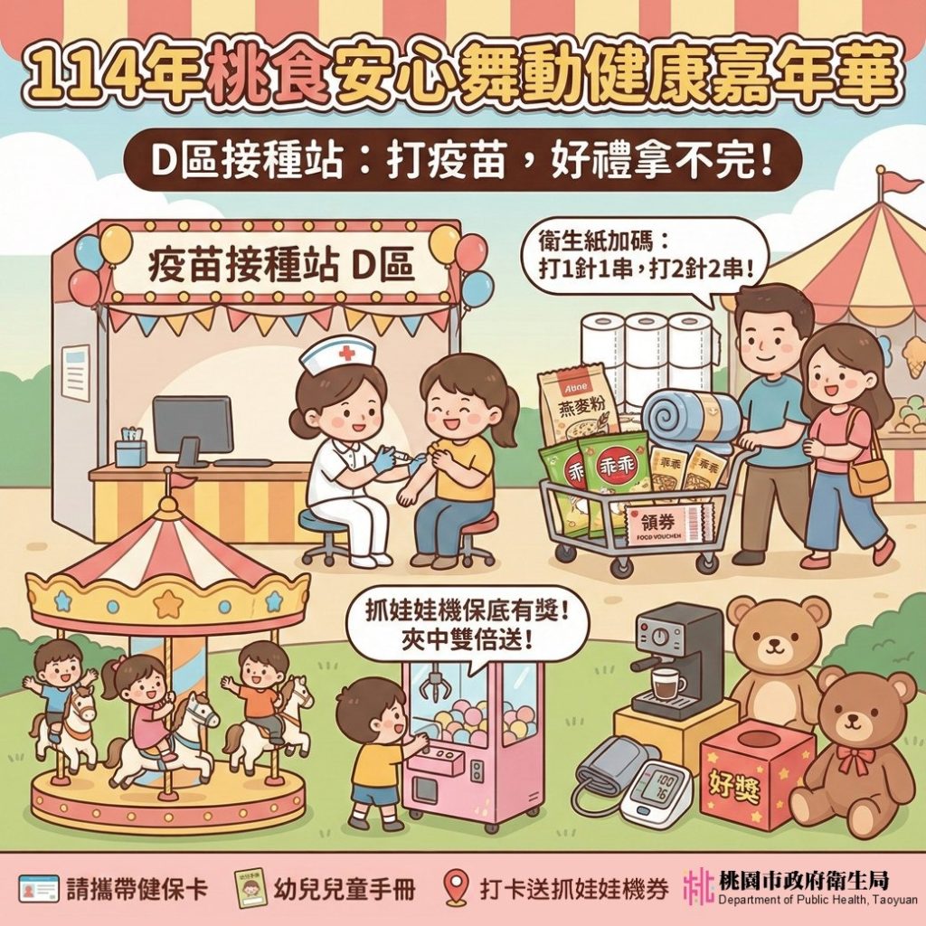 為推廣食品安全與健康生活觀念,桃園市衛生局推出一年一度的「114年桃食安心舞動健康嘉年華」,將於12月6日至7日上午9時到下午16時在桃園藝文廣場登場,其中D區疫苗接種站更推出多項好康活動。50歲以上市民只要攜帶健保卡,學齡前幼兒加帶兒童手冊,前往現場完成疫苗接種,就能帶回多項好禮並免費體驗遊樂設施,鼓勵全民在冬季流感來臨時提早建構完整保護力。