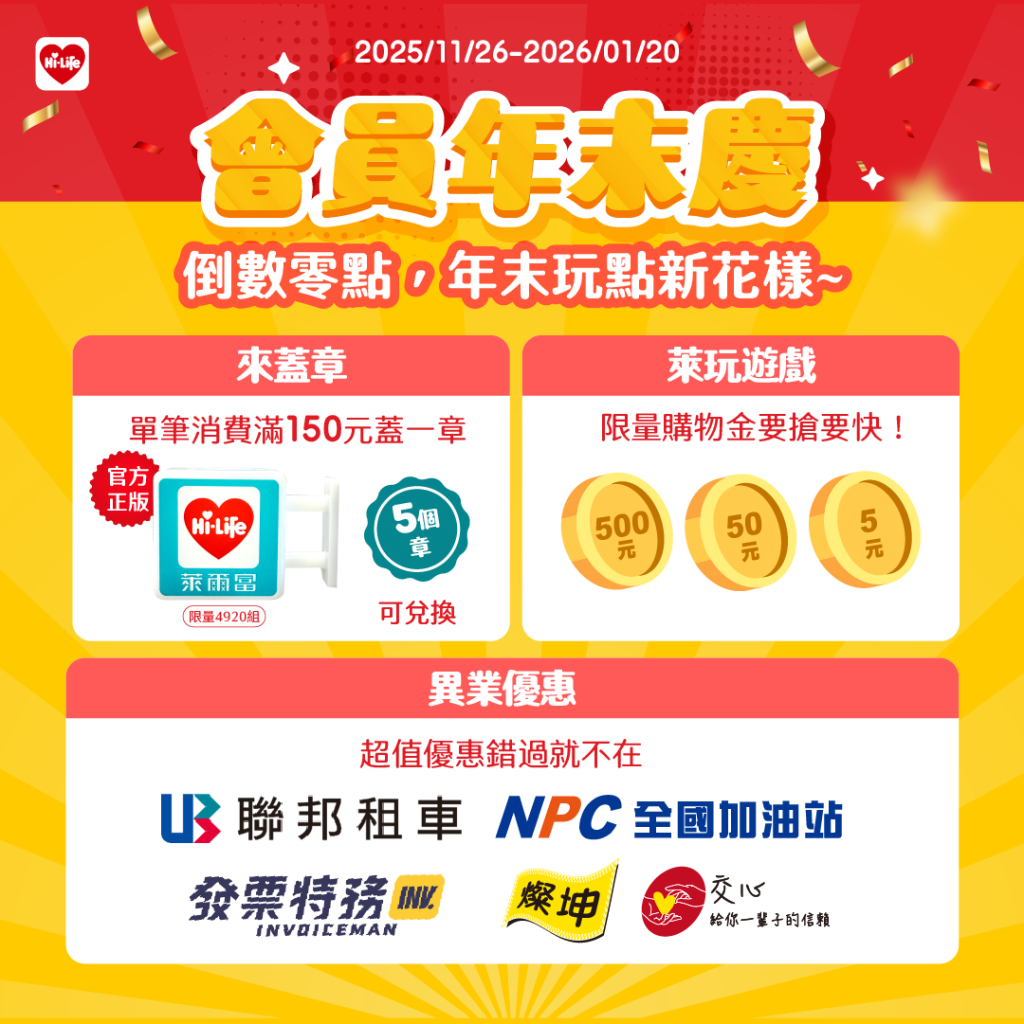 「年末慶蓋章兌好禮」活動自2025年12月5日起至2026年1月20日在萊爾富門市單筆消費滿150元即可獲得一枚印章,且單筆消費可累積印章,買越多蓋越多,讓日常採買就能輕鬆蓋章換好禮。蓋1章可兌中杯美式、拿鐵(冷熱不限)、蓋5個章可兌官方正版萊爾富發光磁吸小燈箱、蓋30個章就可以將變頻電扇直接帶回家!贈品數量有限兌完為止,趕快來萊爾富採買,把實用、精美好禮帶回家! (活動排除整買零取、來送禮、e購卡、遊戲點卡、菸品、代售代付及箱購商品等,活動詳情以活動公告為主。)除了實體消費回饋,萊爾富也同步推出「會員年末慶刮刮卡」活動,即日起至2025年12月23日會員每日只要打開萊爾富官方APP「Hi-Life VIP APP」首頁,點擊「萊玩遊戲」,即可免費獲得兩次刮卡機會,共有25種獎項隨機派送,從購物金、商品飲料到折扣獎項通通有,有機會最高可以獲得500元購物金!趕快加入萊爾富官方APP「Hi-Life VIP APP」天天登入刮驚喜,好康商品優惠拿不完!