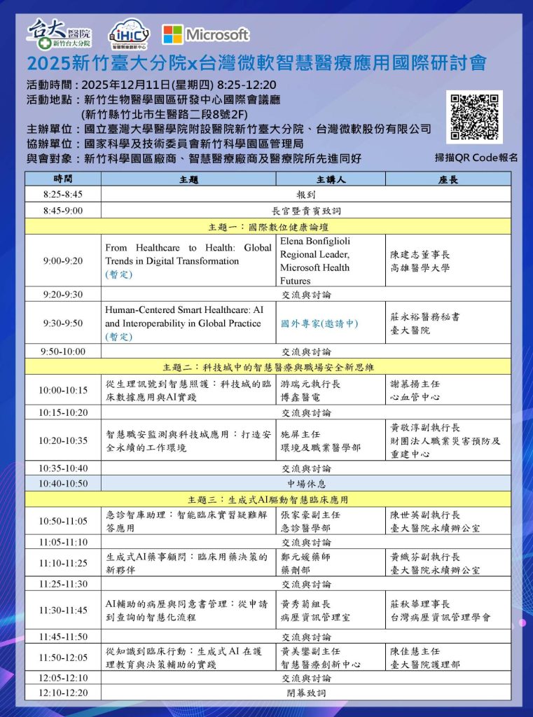 新竹臺大分院誠摯邀請園區廠商、智慧醫療相關業者及醫療院所共襄盛舉,透過跨領域交流與經驗分享,共同推動智慧醫療發展,攜手打造更智慧、安全與永續的醫療環境。