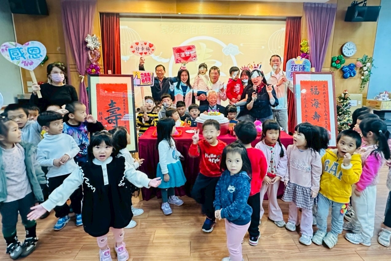 花蓮榮家四日為百歲榮民袁天雄伯伯舉行祝壽典禮,現場洋溢溫馨與歡笑,榮家幼兒園的小朋友特別到場為爺爺獻上生日祝福,童聲合唱與可愛表演為典禮揭開最暖心的序幕,袁伯伯滿心歡喜,不時露出燦爛笑容。