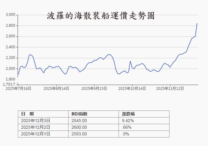 國際散裝船運市場近日攻勢猛,繼本(十二)月一日波羅的海綜合運價指數(BDI)飆漲至超過兩千五百點(2583點),本週四(12/3)升達2845點,其中海岬型指數(BCI)繼攻克4000點,12/3漲至5387點五千點關卡再登新高。(見圖)