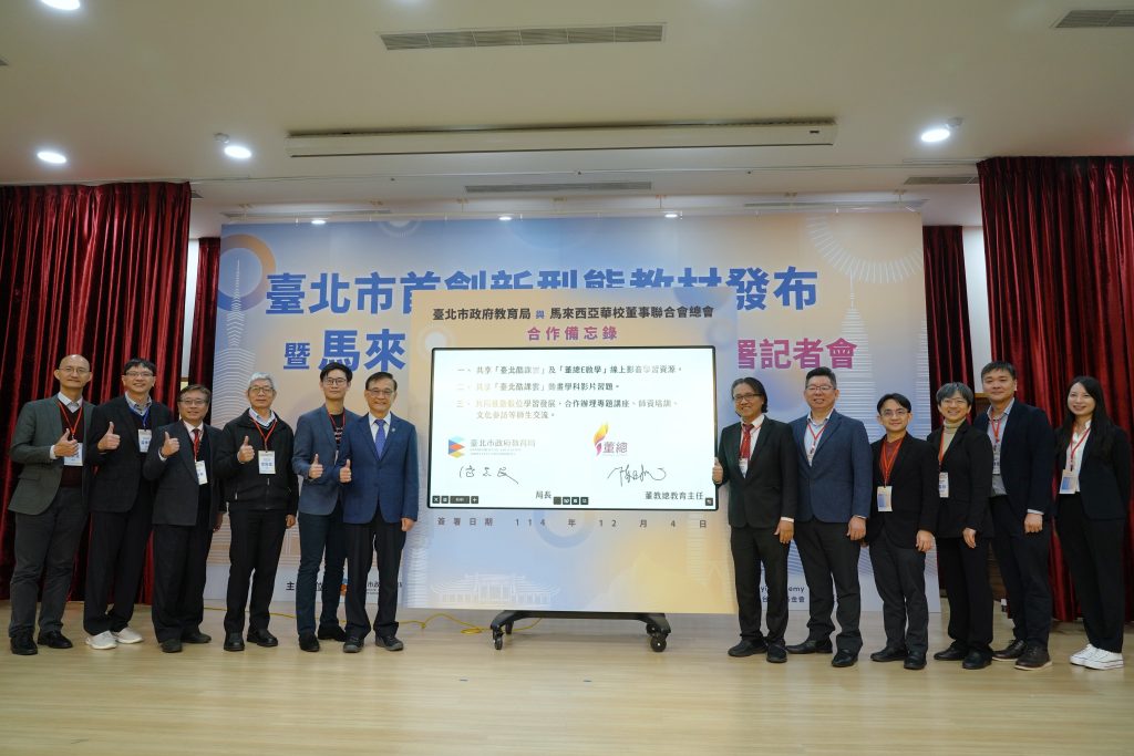 台北市政府教育局四日舉辦「台北市首創新型態教材發布暨馬來西亞董總MOU簽署記者會」,正式發布全國首創「線上動畫影片+紙本學習單+AI輔助」新型態教材配套,實現「線上啟發、線下鞏固」的雙向互動學習模式,預計惠及馬來西亞當地約八萬名師生,象徵台北市數位教育成果獲得國際肯定,並充分展現台北市在AI教育與數位教材創新的領航角色。