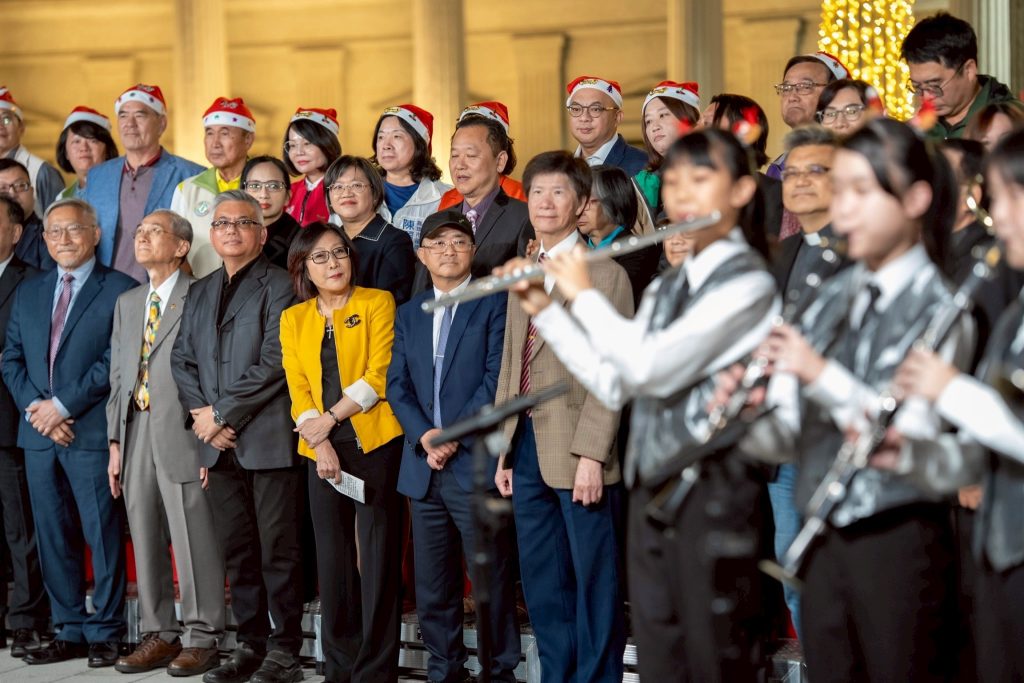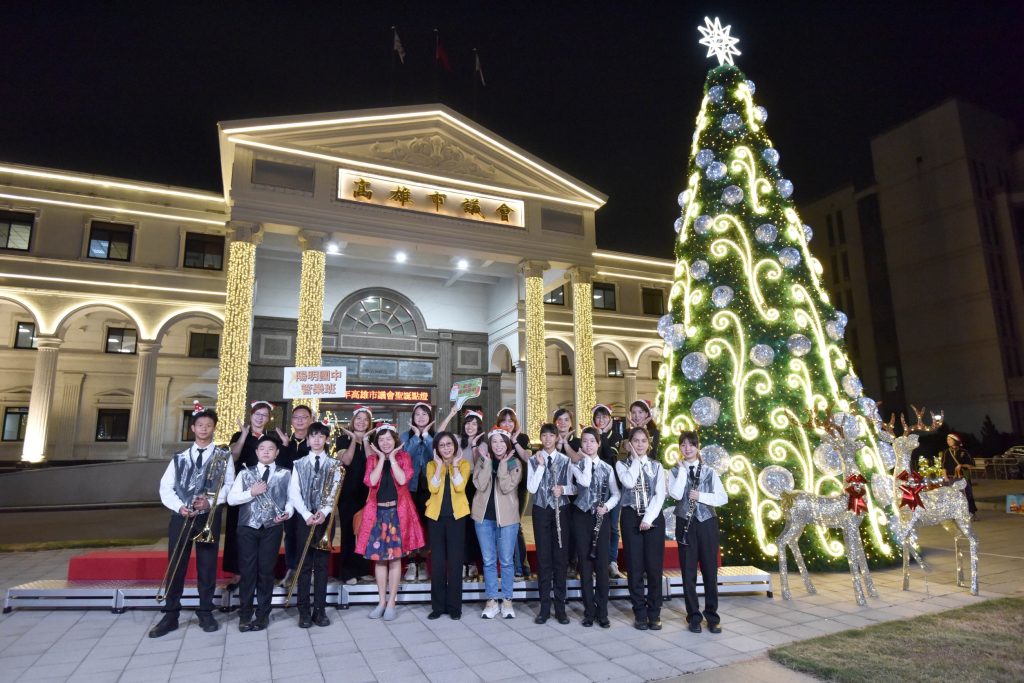 高雄市議會聖誕樹四日晚上,在陽明國中管樂班悠揚音樂聲中正式點亮。(記者 吳文欽攝)
