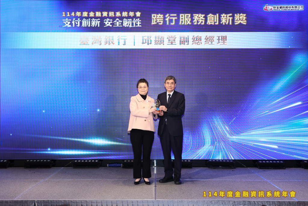 財金資訊股份有限公司於114年12月4日舉辦金融資訊系統年會頒獎典禮,臺灣銀行以卓越的防詐成效與金融服務創新力,榮獲「阻詐聯防貢獻獎」及「跨行服務創新獎」兩項殊榮,由邱顯堂副總經理代表受獎。