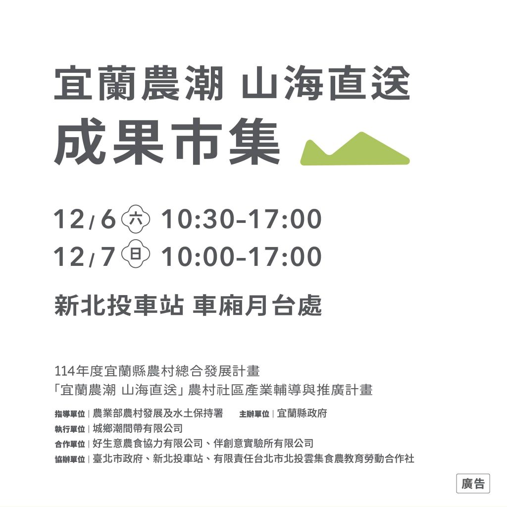 宜蘭縣政府將於六、七日舉辦「一一四年度宜蘭農潮.山海直送」成果展,首度移師台北市新北投車站與七星公園盛大登場。活動以「計畫成果展示」、「農潮市集」及「主題交流短講」三大主軸,邀請北部民眾透過市集與展覽體驗,感受宜蘭友善農產的魅力及深厚農村再生精神。