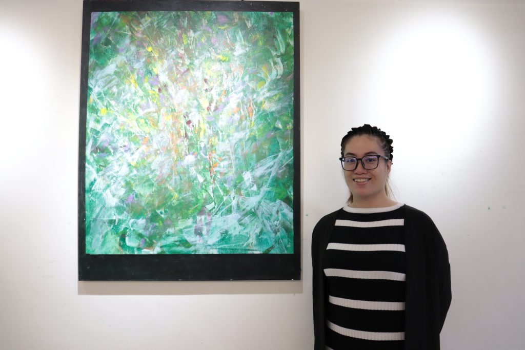此次展出陳怡君的三十多幅作品,其獨特的風格讓人不免流連再三,壓克力畫如油畫般立體,線條展現出自由的韻味。她表示,壓克力顏料很快就定型,不易修改,她也不會去修改,創作隨心所欲,就像她自己破繭而出一樣,也希望觀眾能感受到其中蘊含的自由味道。