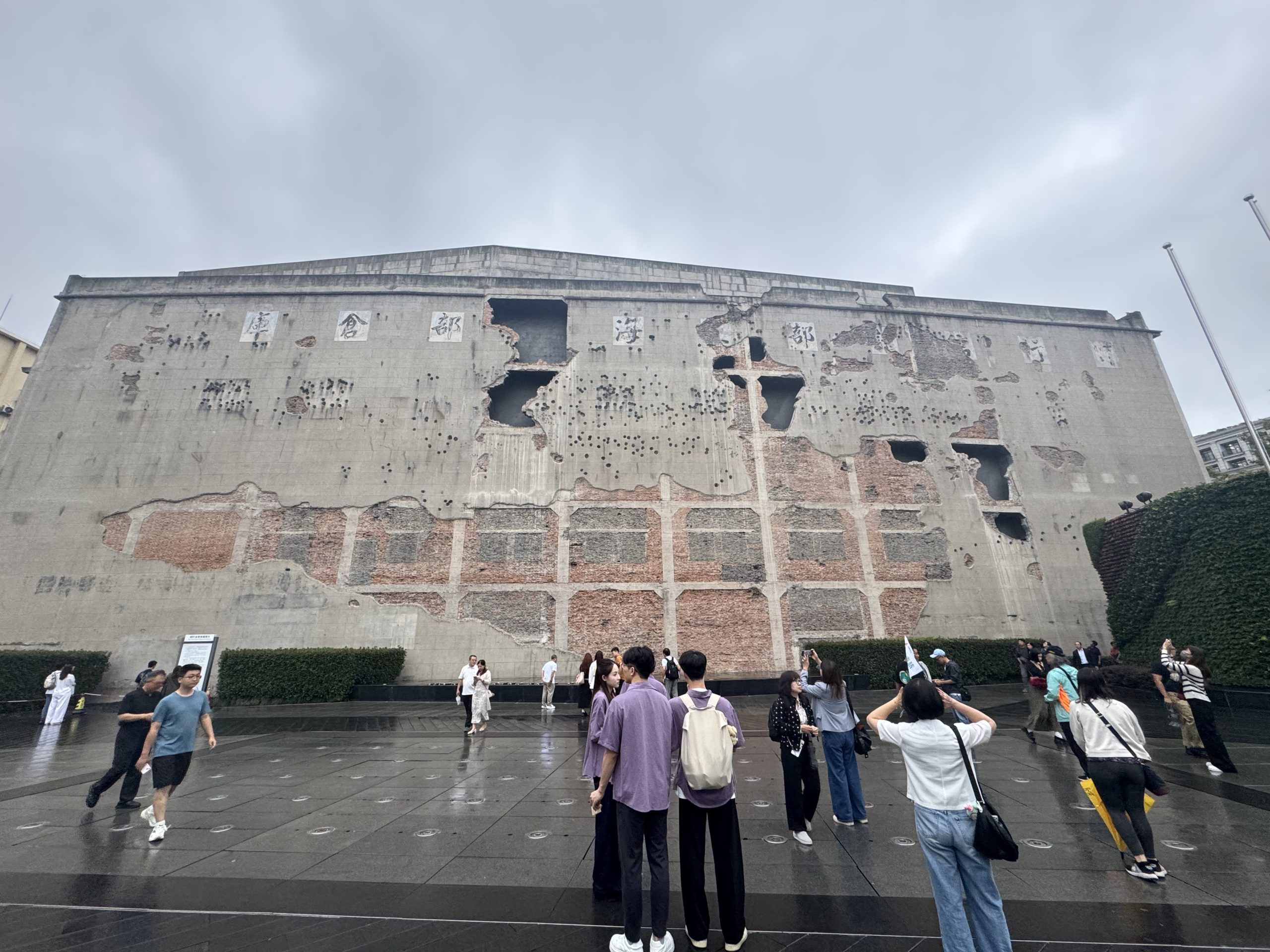 步入四行倉庫抗戰紀念館,首先映入眼簾的,是以原建築外牆彈孔痕跡復原而成的展示立面,密集凹陷的彈痕與灰色牆面形成強烈視覺震撼,提醒著歷史從不遙遠,館方特意保留這種不修飾的記憶,讓遊客在第一時間便能感受到那段戰火歲月的重量。