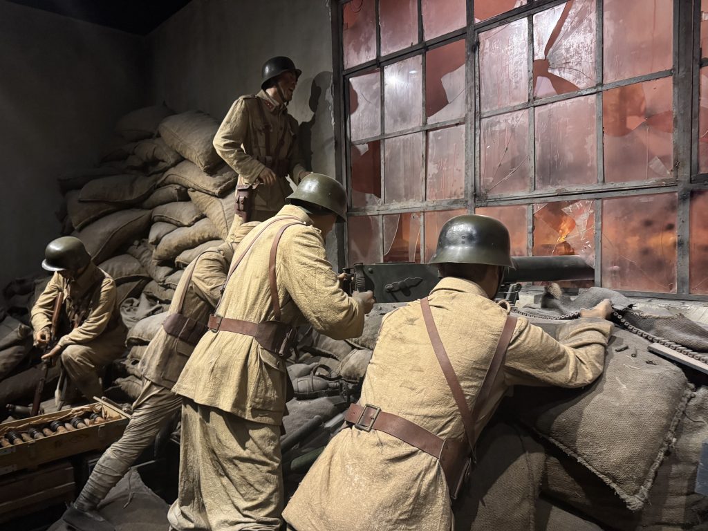 走進四行倉庫抗戰紀念館的沉浸式戰鬥場景區,燈光、聲效與實景布置讓人瞬間回到1937年淞滬會戰最緊張的時刻。展區以等比例還原倉庫內部防守據點,沙包、彈箱與破碎玻璃窗前,士兵全神貫注架起機槍、裝填手榴彈、警戒樓外動向,神情專注而堅定。窗外紅光閃動,象徵戰火逼近,強烈的光影對比使現場氣氛緊繃,彷彿仍能聽見槍聲回響。