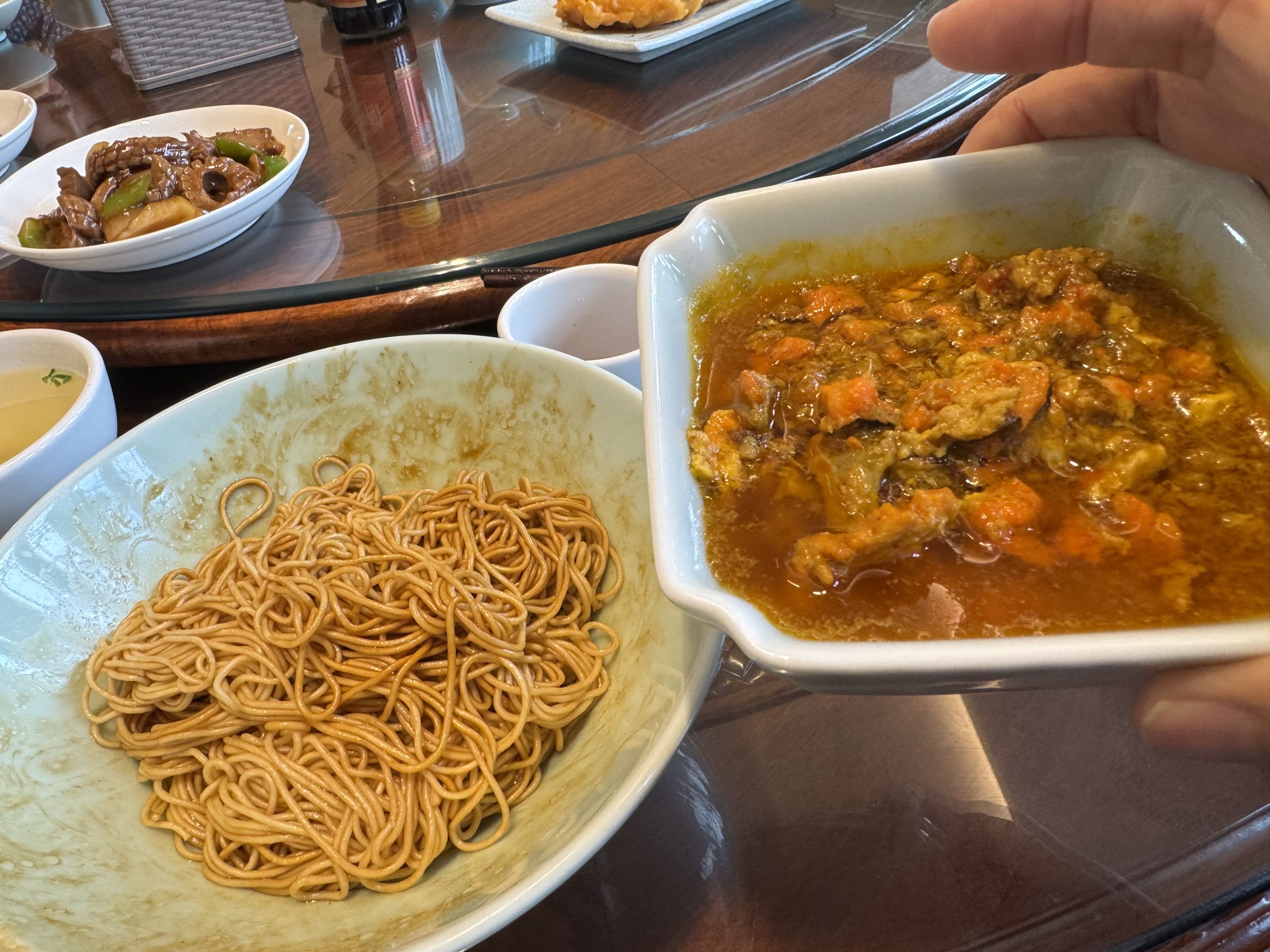 所謂禿黃油,並非家常的蛋黃混油,而是以當季鮮活螃蟹拆取蟹黃與蟹膏,經細火慢熬,使蟹香與油脂緩緩融合,呈現濃而不膩、鮮而不腥的金潤質地。等麵條煮至入口柔韌、筋道適口後,趁熱舀入一勺禿黃油,略加拌勻,蟹香即被激活,伴隨熱氣向上升騰,香氣溫柔卻有力量。