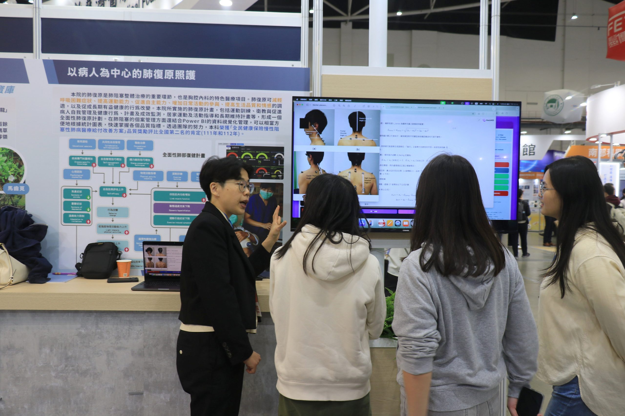 醫師陳佳菁(左)在展位向民眾解說「AI智慧姿勢評估系統」,透過電腦視覺技術,精準分析背部骨骼排列與歪斜程度。(記者徐義雄翻攝)