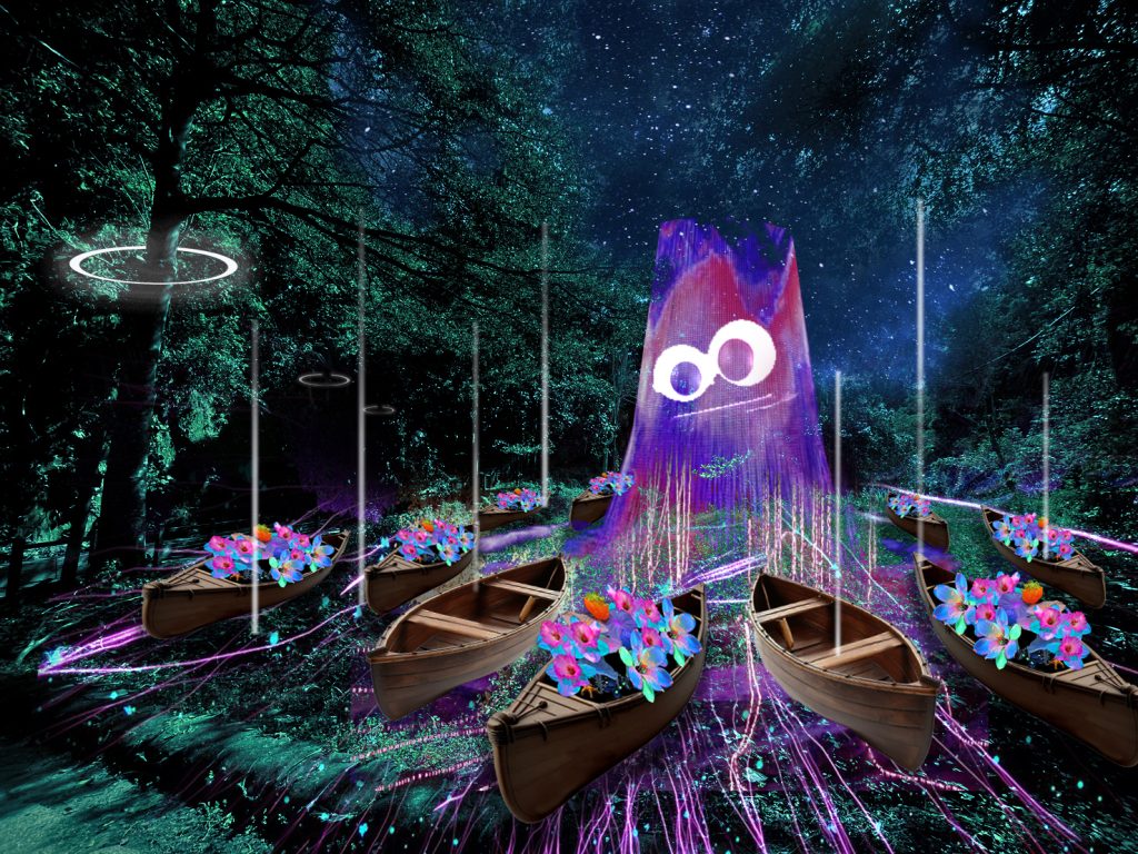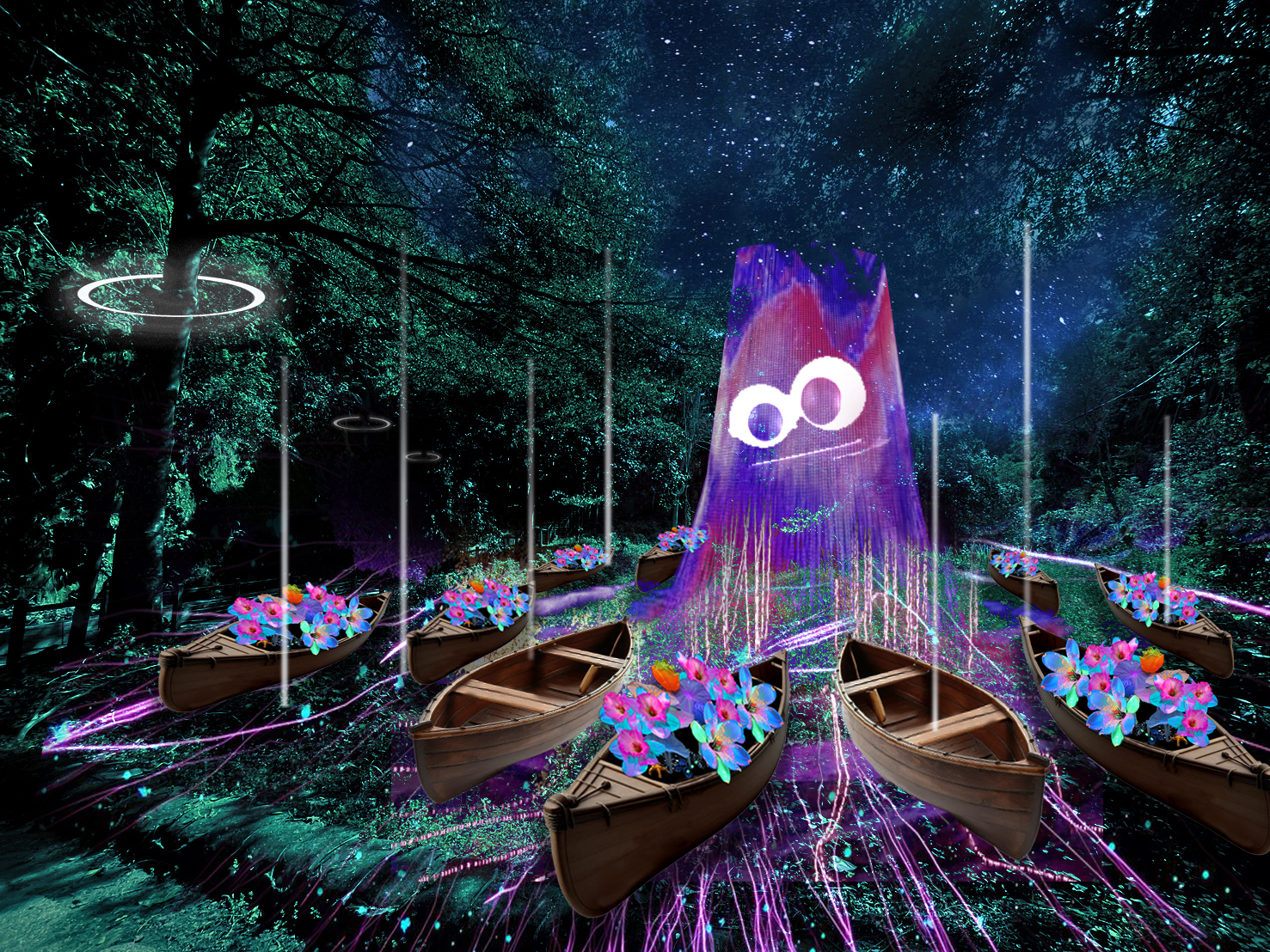 十四組作品分布於入口、河谷、步道與觀景台,光影、聲響與場域相互串聯,形成一座隨步伐推進的「山林光影藝廊」,展場中更有包含多組結合光影、AI生成、機械動態與聲音環境的多媒體創作,年度主燈《山林呼喚 》以「山林靈氣的覺醒」為概念,透過大型光影結構、呼吸節奏與環境音場塑造山林守護者意象。