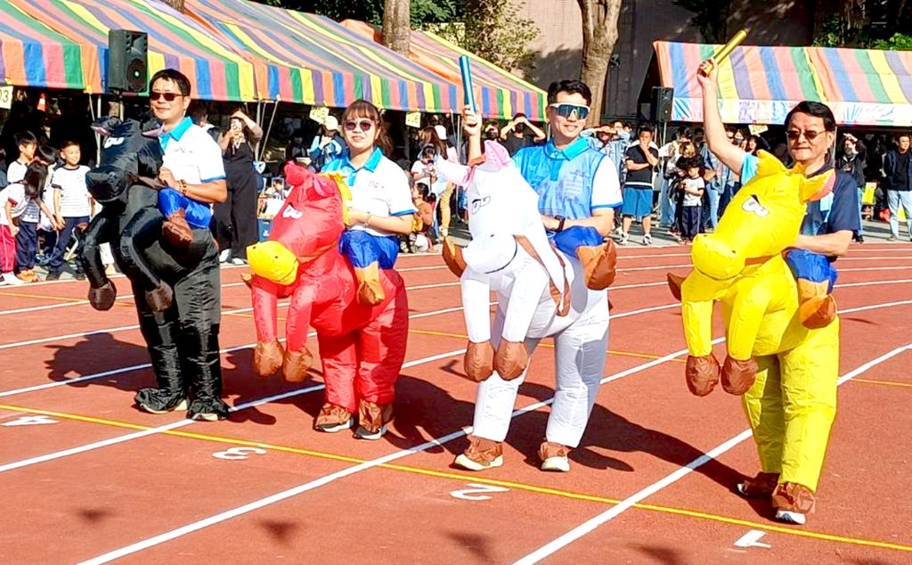 親師大隊接力賽,老師、家長會參加非常踴躍,共分成四組進行,各組第一棒均穿著騎馬裝組成「四馬難追」,包括服務教育四十年的校長吳博明代表的「識途老馬」,次為甫挑戰完戈壁馬拉松的家長會長蔡偉聰代表的「戈壁馬」,充滿活力副會長吳芸綺代表的「古都馬」,及完成百場馬拉松的副會長楊宗洲代表的「一百馬」,手持接力棒競跑,創意妝扮吸引眾人目光。