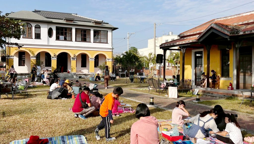 參與兒童寫生的孩子們,在陽光下鋪開畫紙,專注描繪黃白相間的百年洋樓、家長一起坐在綠意盎然的草皮上欣賞美麗的藍天白雲,耳邊聽著悅耳歌曲,相當療癒。