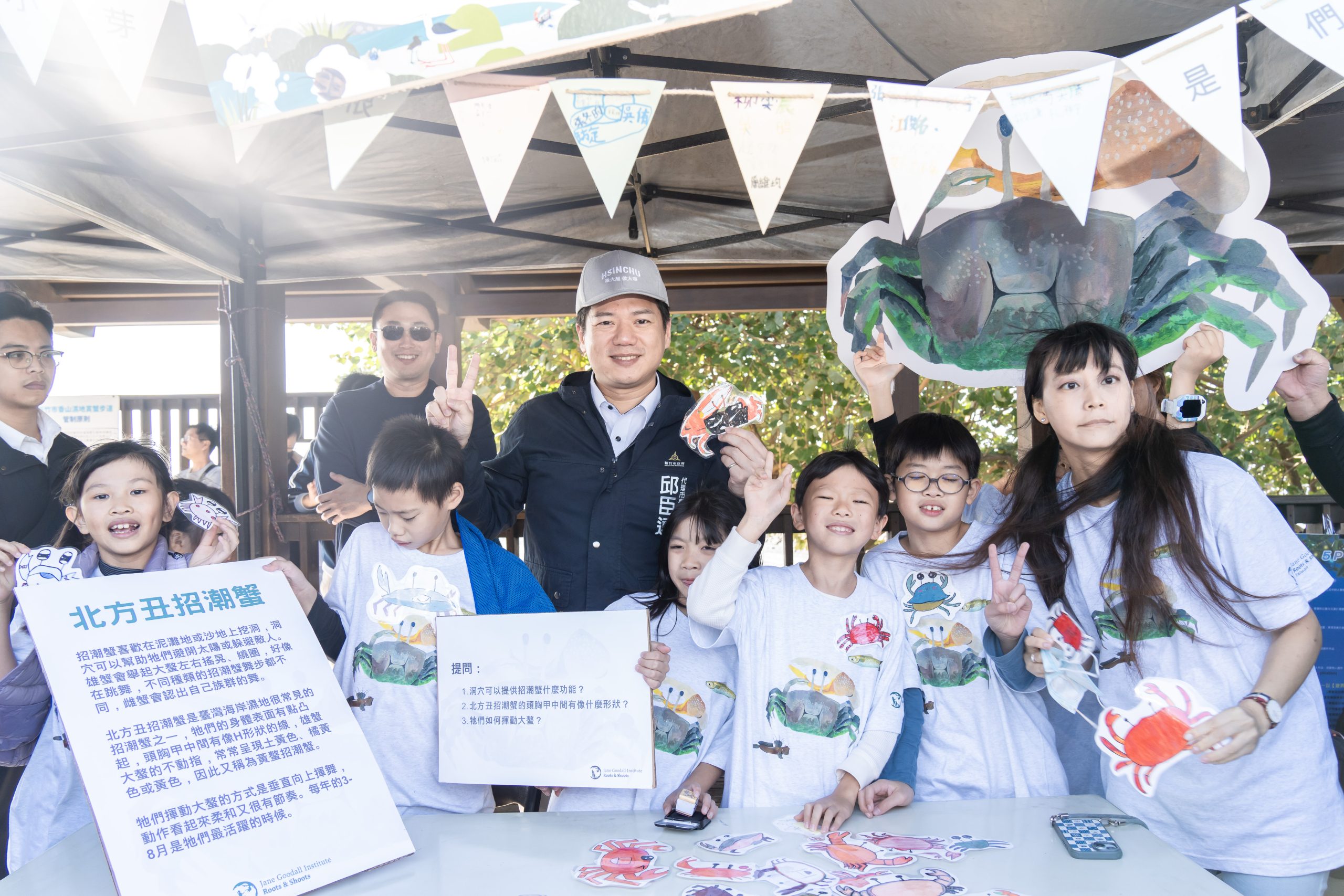 「二0二五根與芽濕地嘉年華」六日在新竹市香山濕地海洋保育教育中心登場,吸引親子及學校團隊變裝濕地動物參與遊行,代理市長邱臣遠至現場與學童互動。(記者曾芳蘭攝)