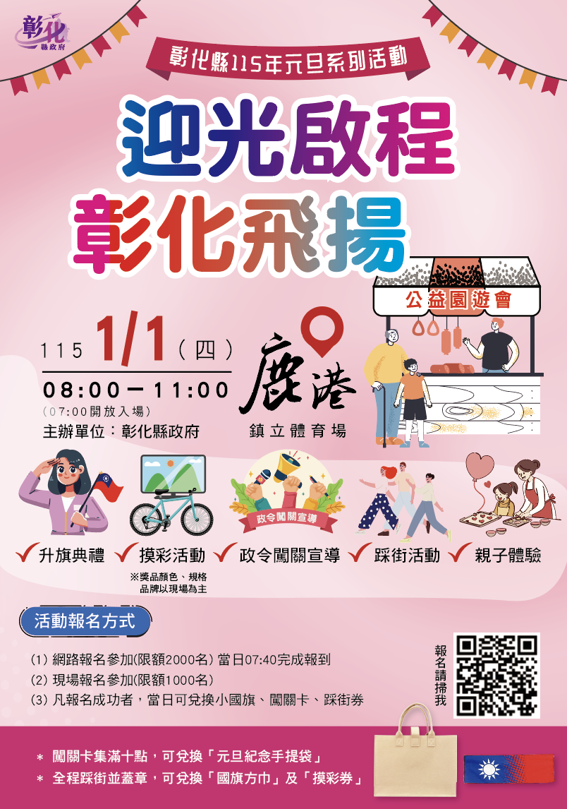 為迎接中華民國一一五年元旦,彰化縣政府將於一一五年一月一日上午八時至十一時,在鹿港鎮立體育場舉辦「迎光啟程.彰化飛揚」元旦系列活動。縣長王惠美邀請縣民在新年的第一天清晨,與家人、朋友一同參加元旦系列活動,到場歡慶元旦新年喜悅!